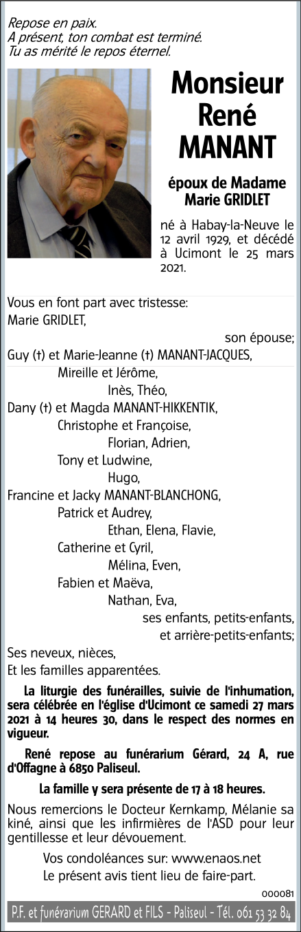 Décédé à Ucimont (6833) le jeudi 25 mars 2021 à l'âge de 91 ans