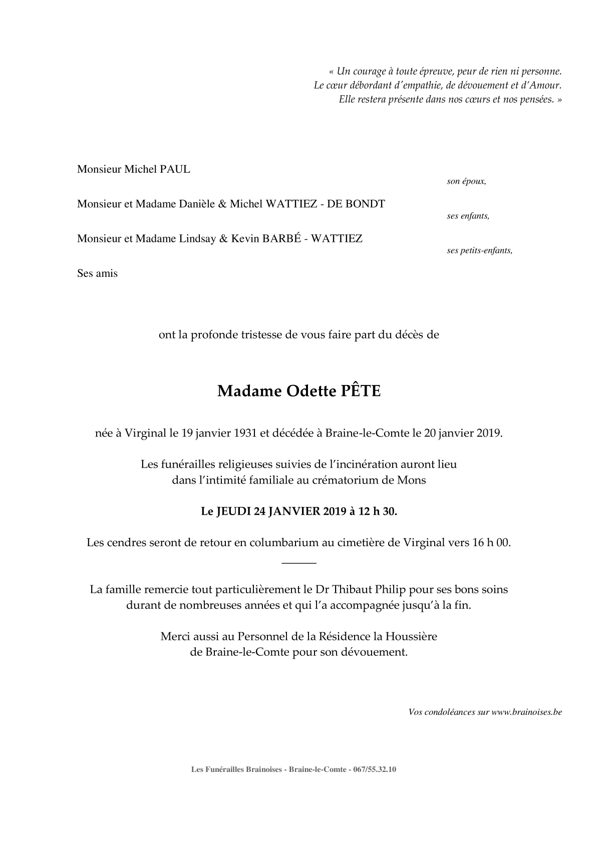 Décédée à Braine-le-Comte (7090) le dimanche 20 janvier 2019 à l'âge de 88 ans