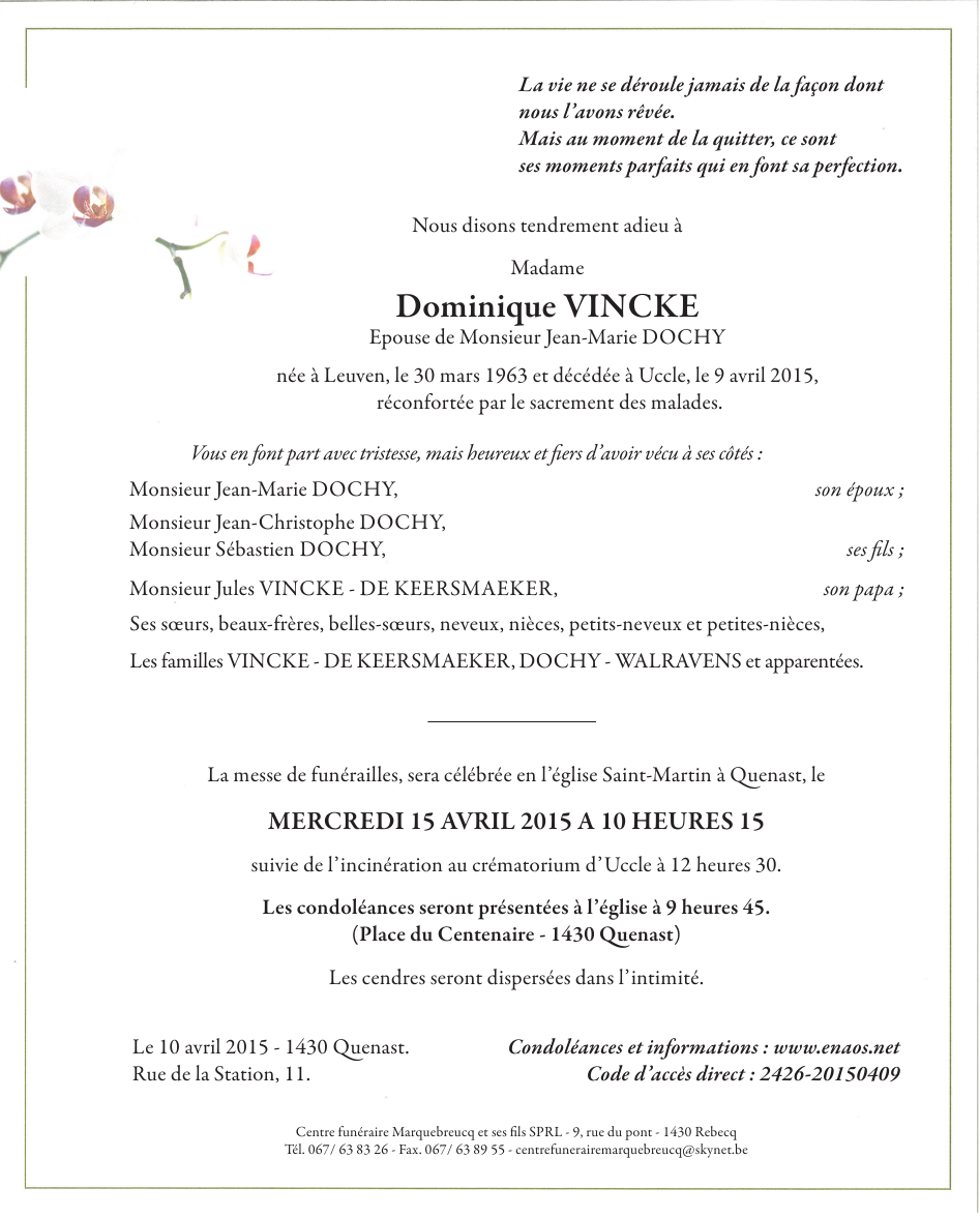 Décédée à Uccle (1180) le jeudi 9 avril 2015 à l'âge de 52 ans