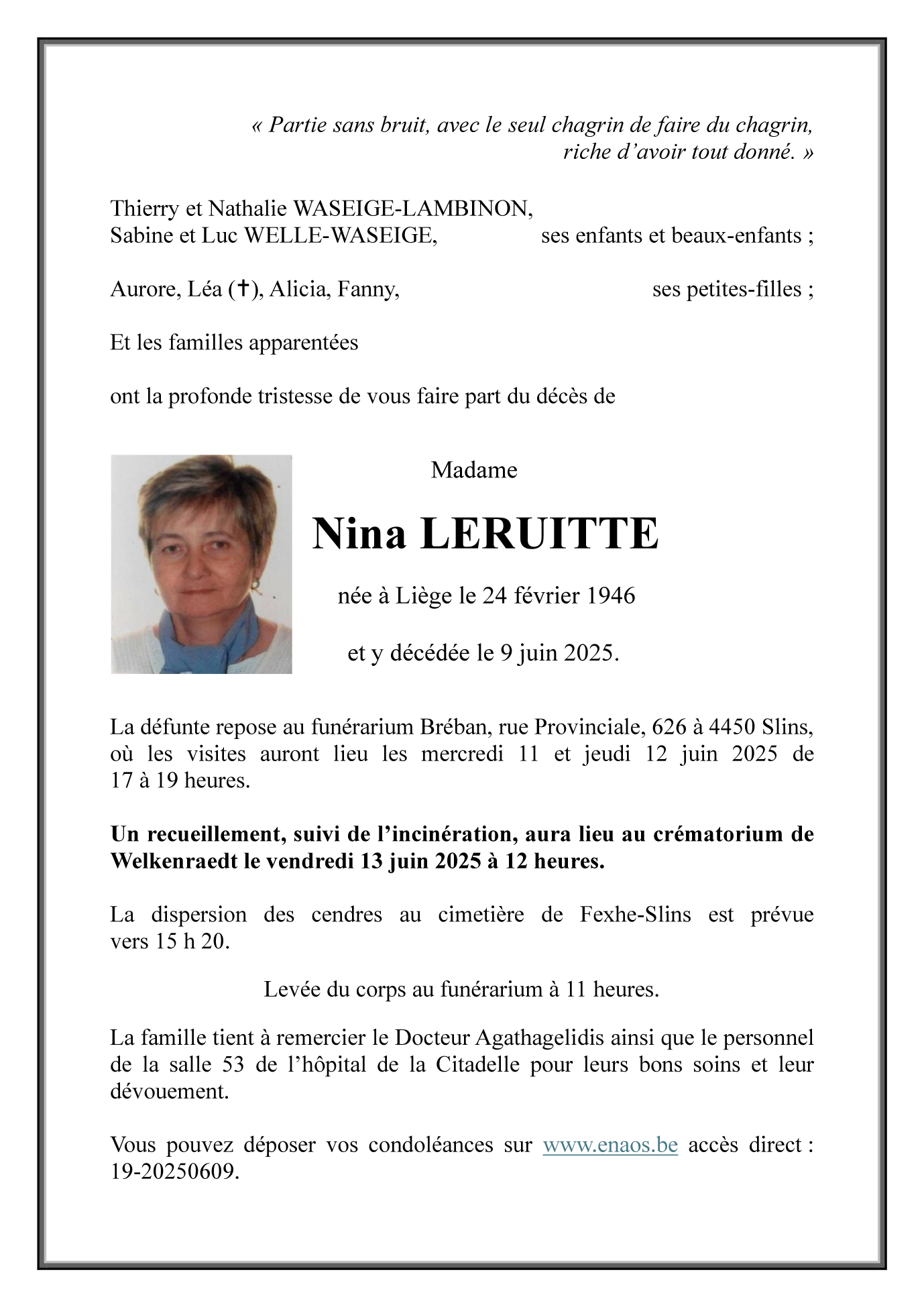Décédée à Liège (4000) le lundi 9 juin 2025 à l'âge de 79 ans