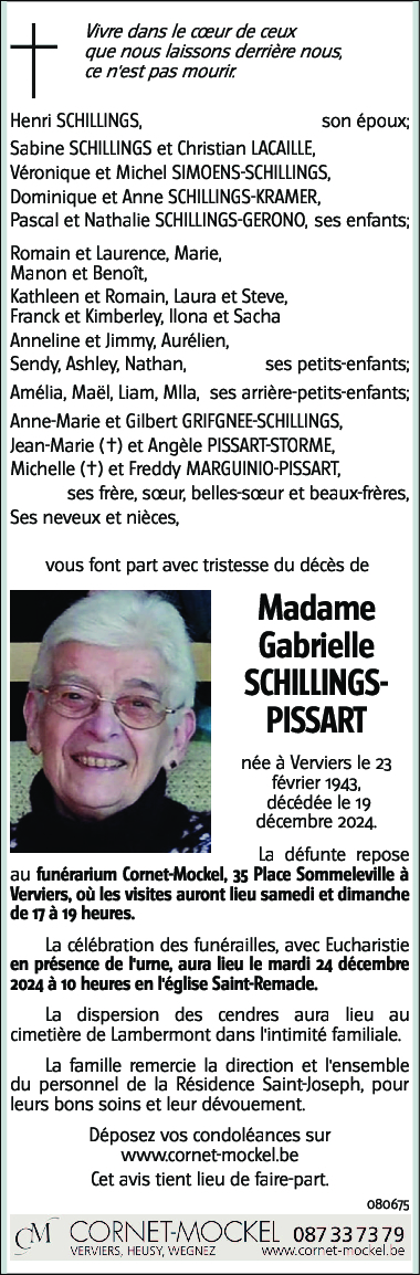 Décédée à Verviers (4800) le jeudi 19 décembre 2024 à l'âge de 81 ans