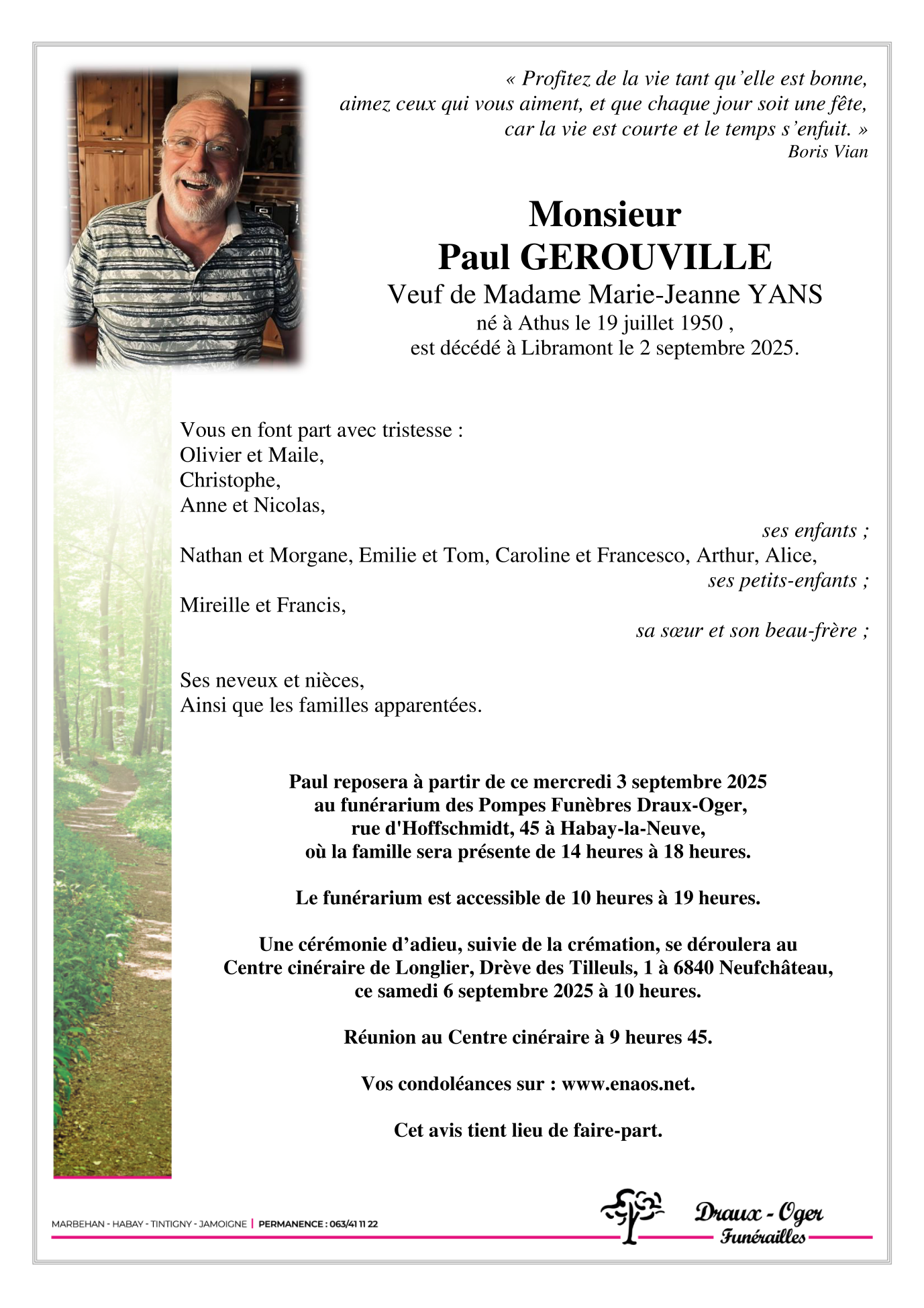Décédé à Libramont-Chevigny (6800) le mardi 2 septembre 2025 à l'âge de 75 ans