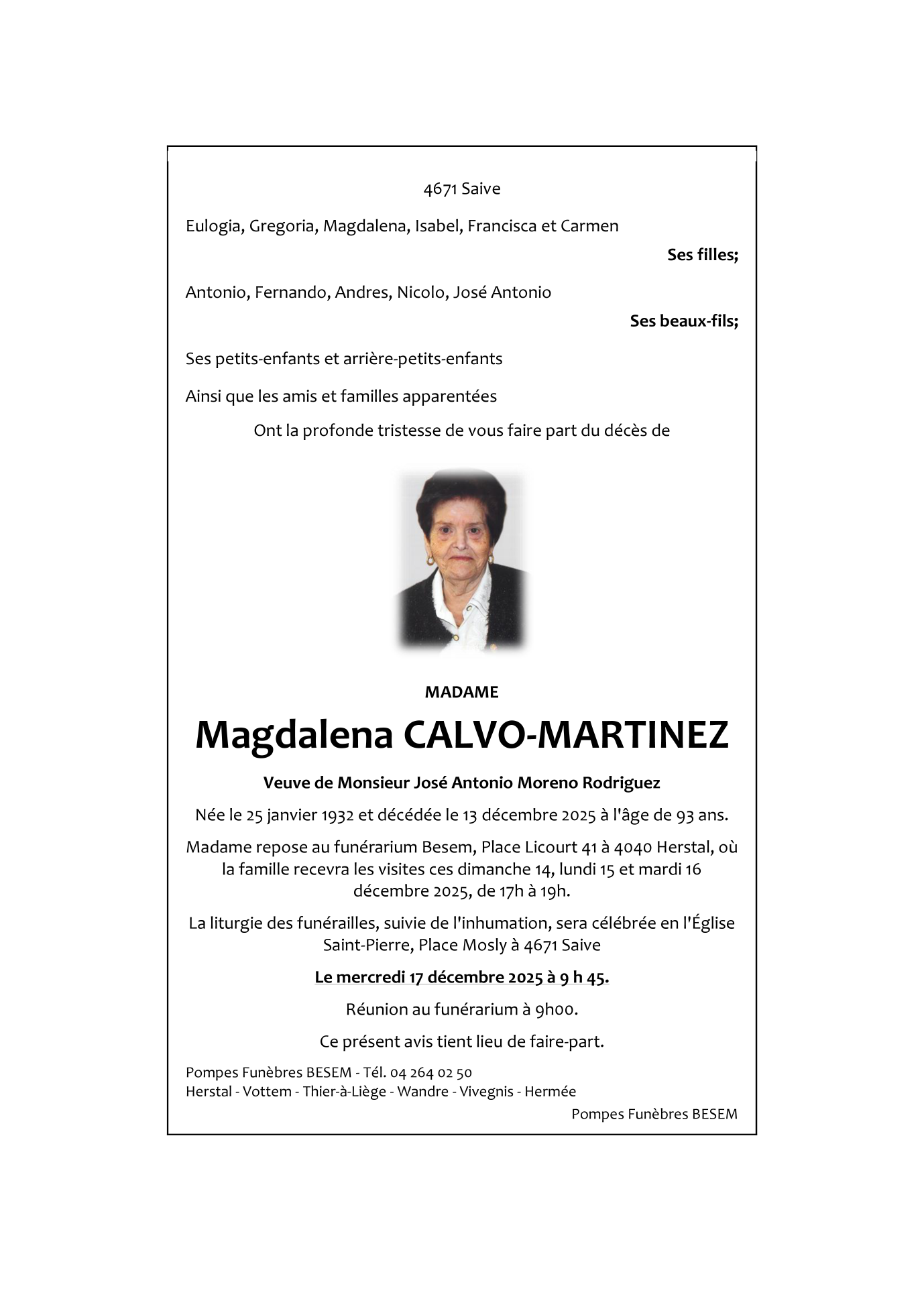 Décédée à Vottem (4041) le samedi 13 décembre 2025 à l'âge de 93 ans