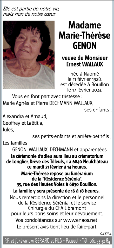 Died in Bouillon (6830) on 17 February 2023 at the age of 95 years