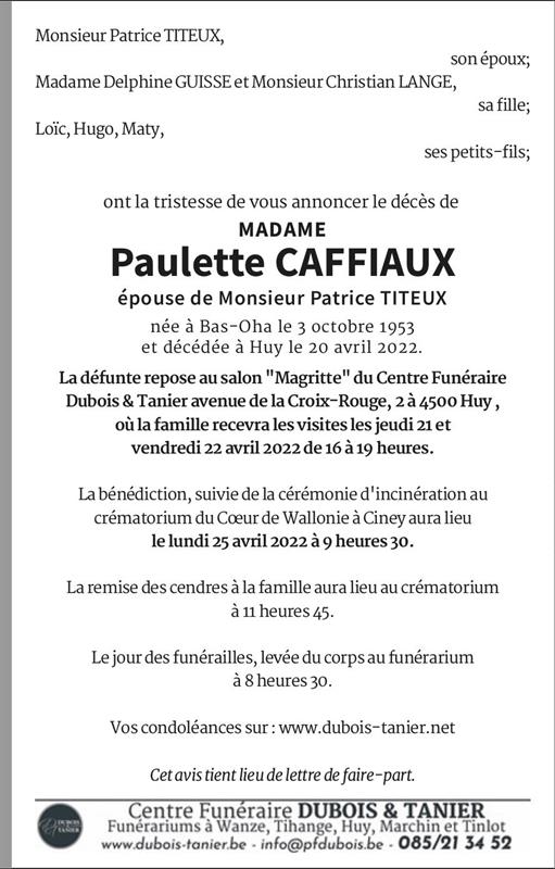 Décédée à Huy (4500) le mercredi 20 avril 2022 à l'âge de 68 ans