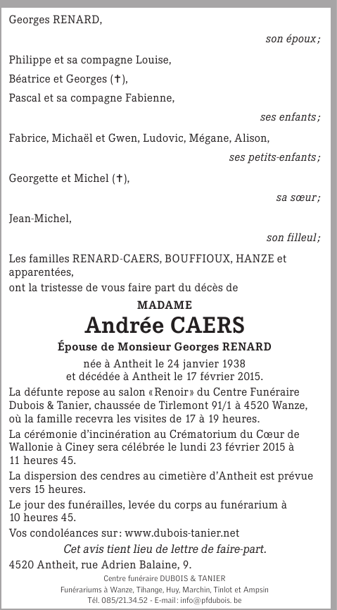 Décédée à Antheit (4520) le mardi 17 février 2015 à l'âge de 77 ans