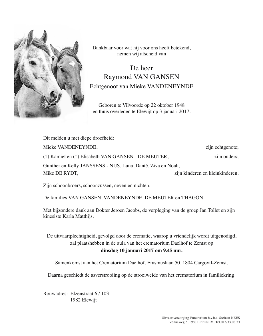 Décédé à Elewijt (1982) le mardi 3 janvier 2017 à l'âge de 68 ans