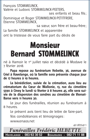 Décédé à Modave (4577) le mercredi 7 février 2018 à l'âge de 57 ans