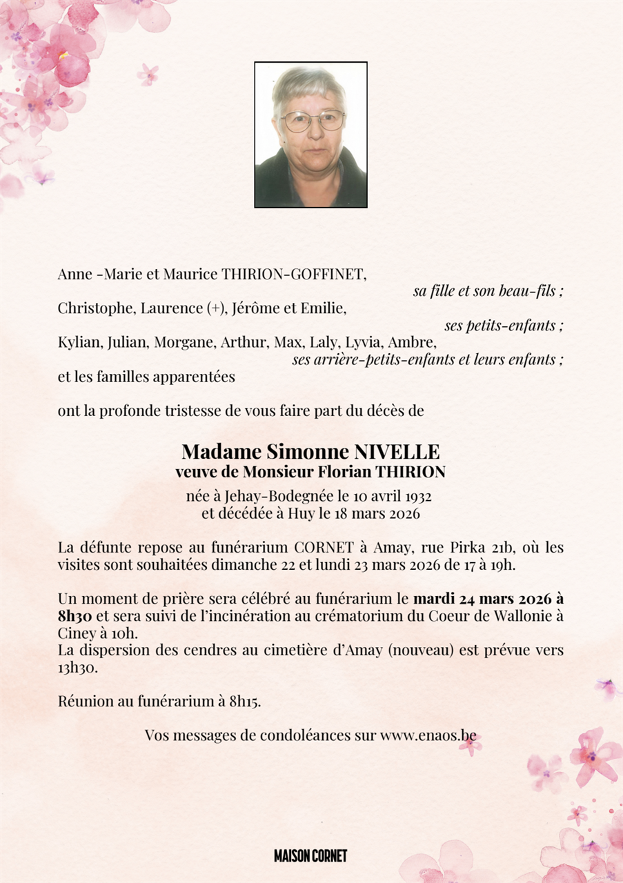 Décédée à Huy (4500) le mercredi 18 mars 2026 à l'âge de 93 ans