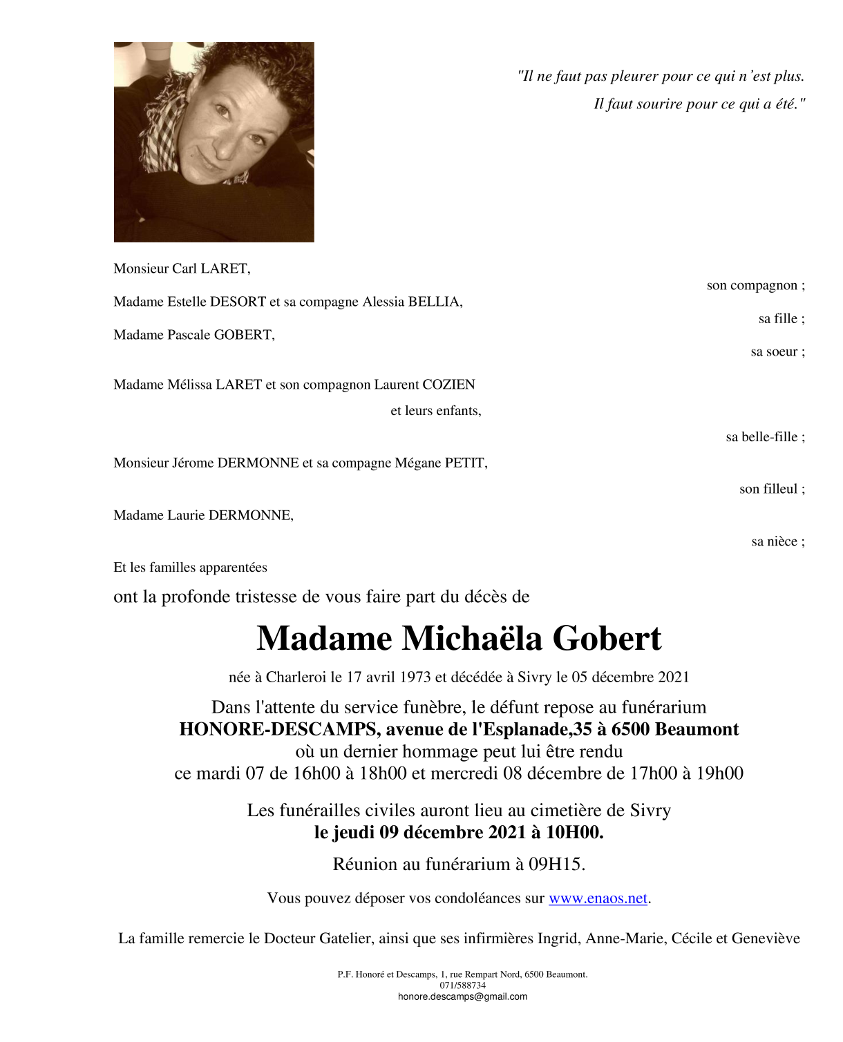 Décédée à Sivry (6470) le dimanche 5 décembre 2021 à l'âge de 48 ans