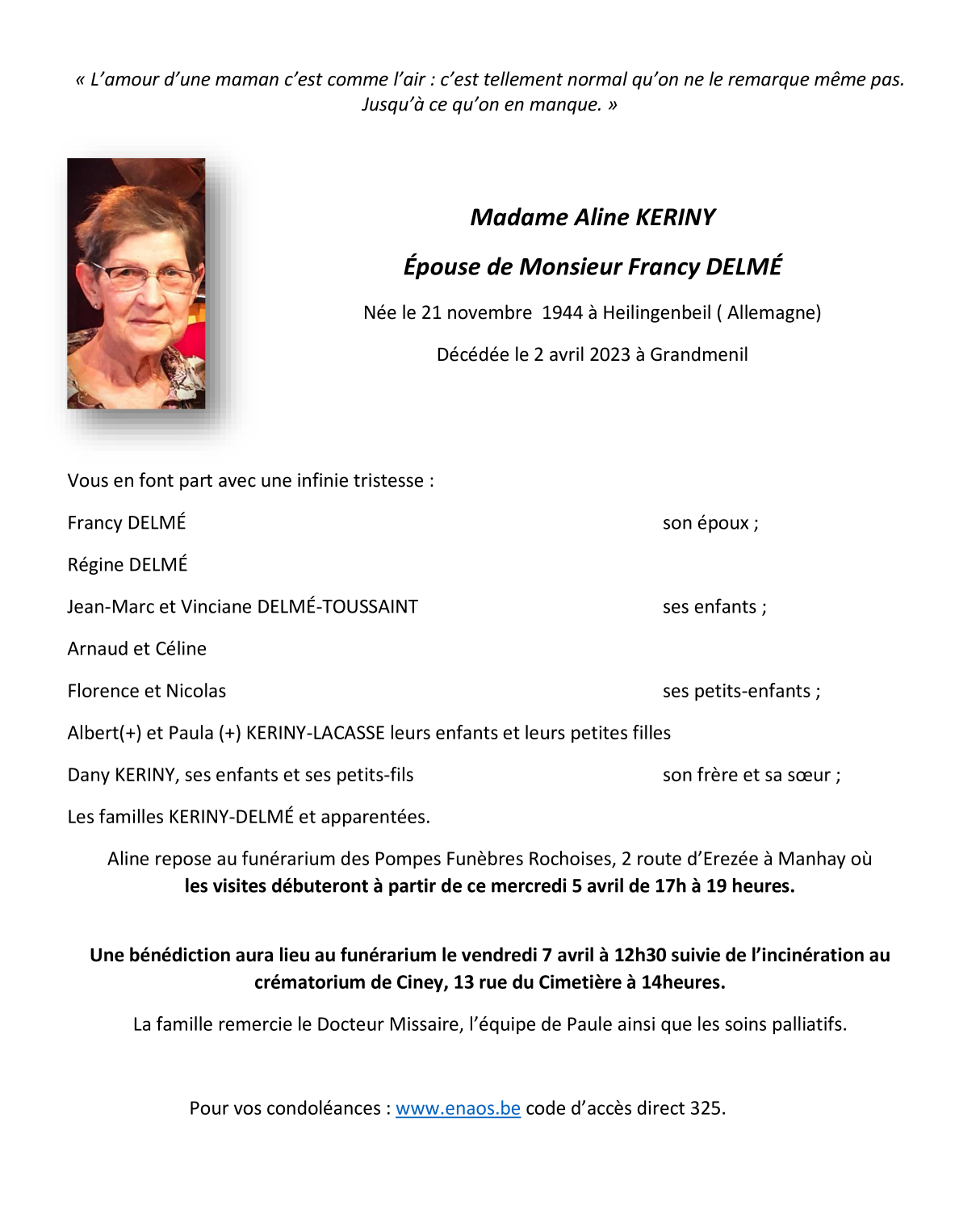 Décédée à Manhay (6960) le dimanche 2 avril 2023 à l'âge de 78 ans