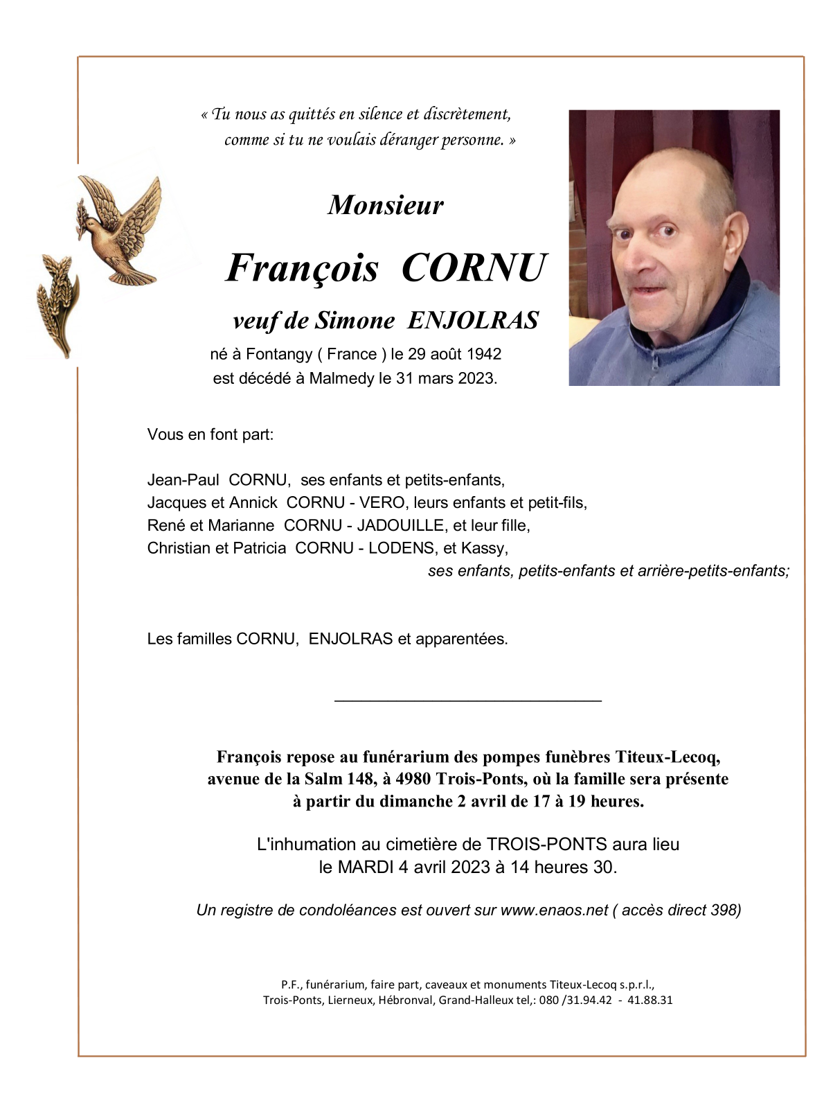 Décédé à Malmedy (4960) le vendredi 31 mars 2023 à l'âge de 80 ans