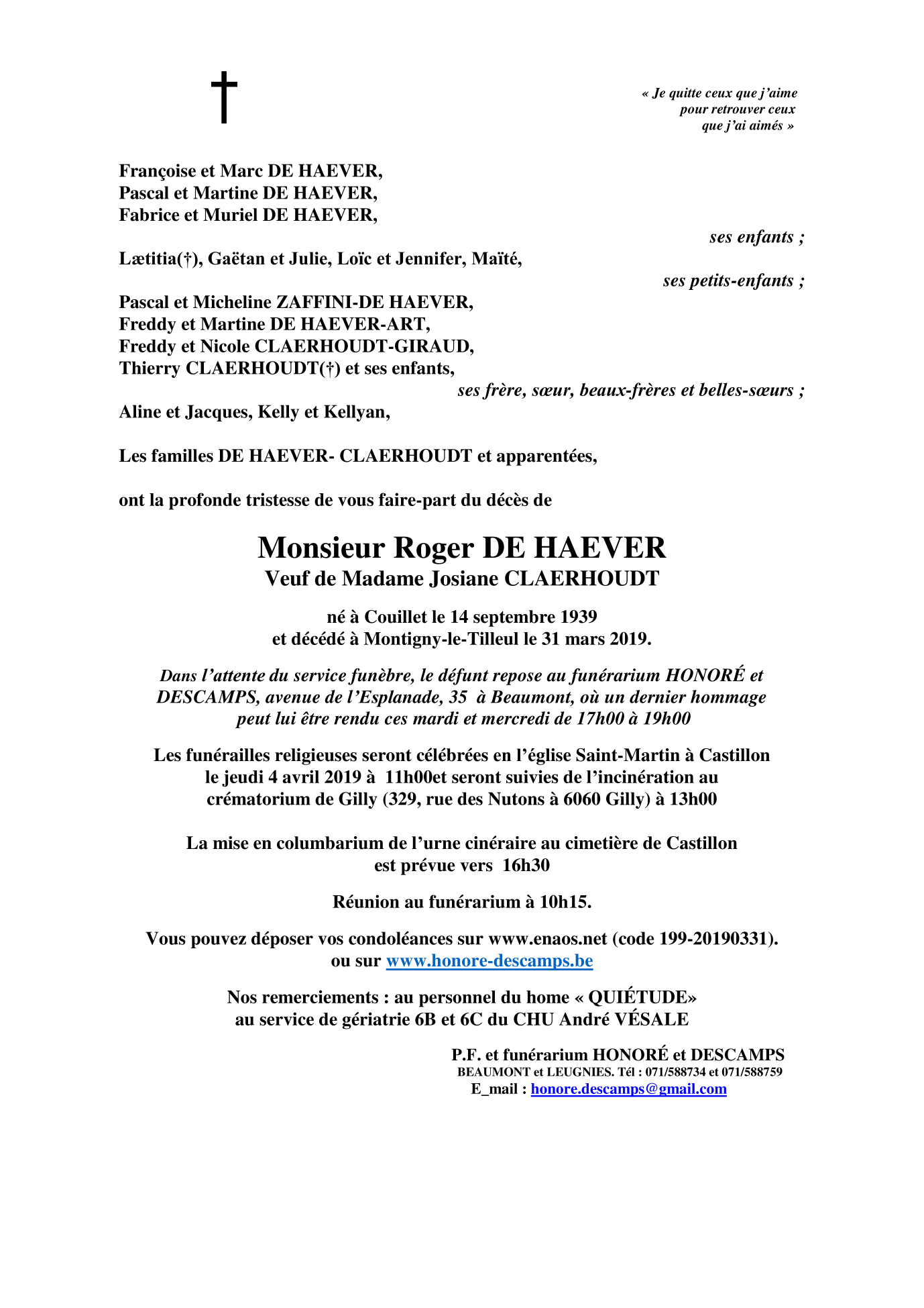 Décédé à Montigny-le-Tilleul (6110) le dimanche 31 mars 2019 à l'âge de 79 ans