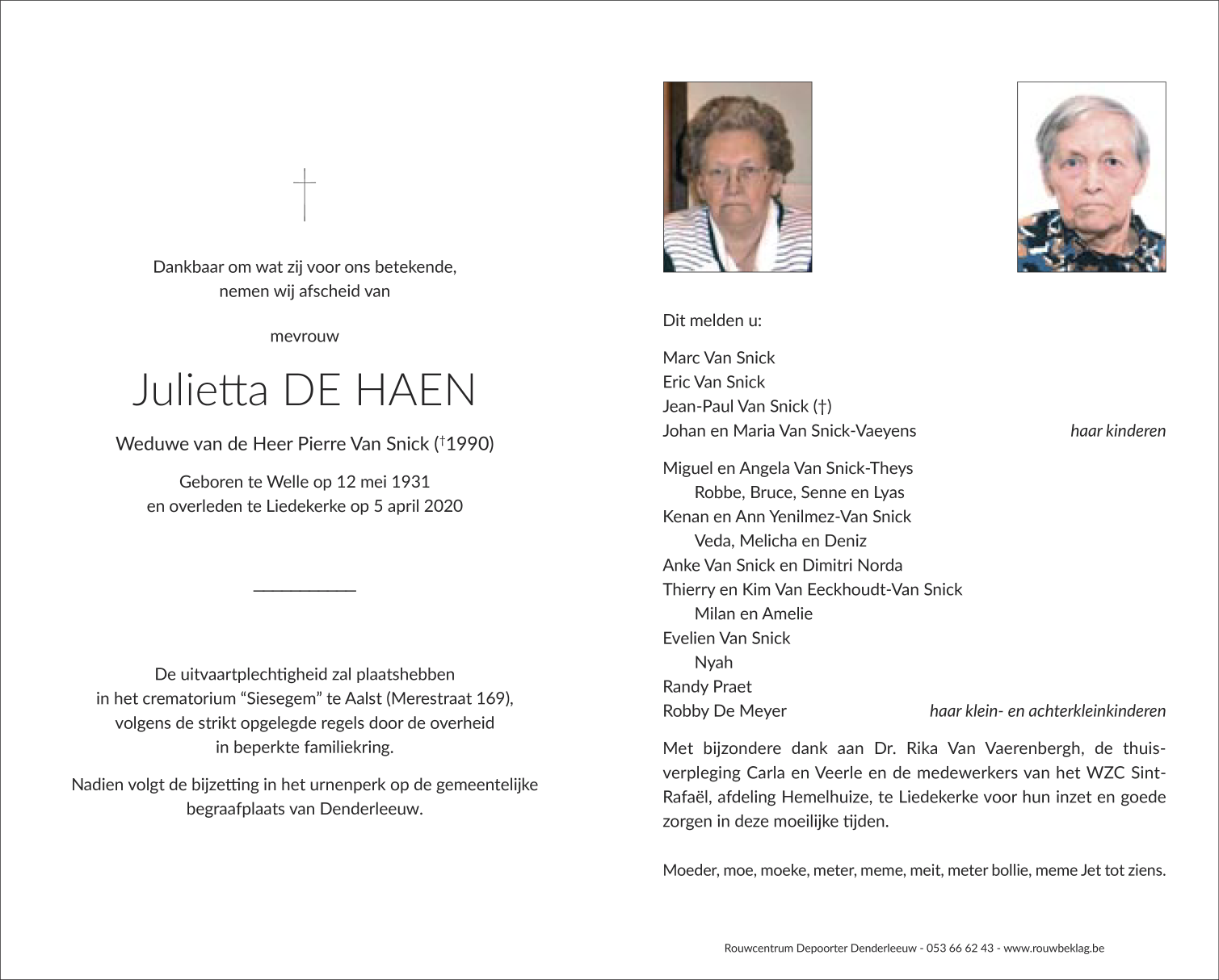 Décédée à Liedekerke (1770) le dimanche 5 avril 2020 à l'âge de 88 ans