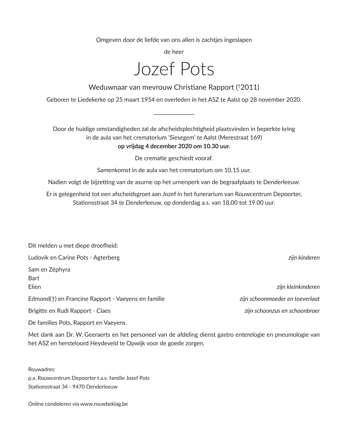 Overleden te Aalst (9300) op zaterdag 28 november 2020 op 66-jarige leeftijd