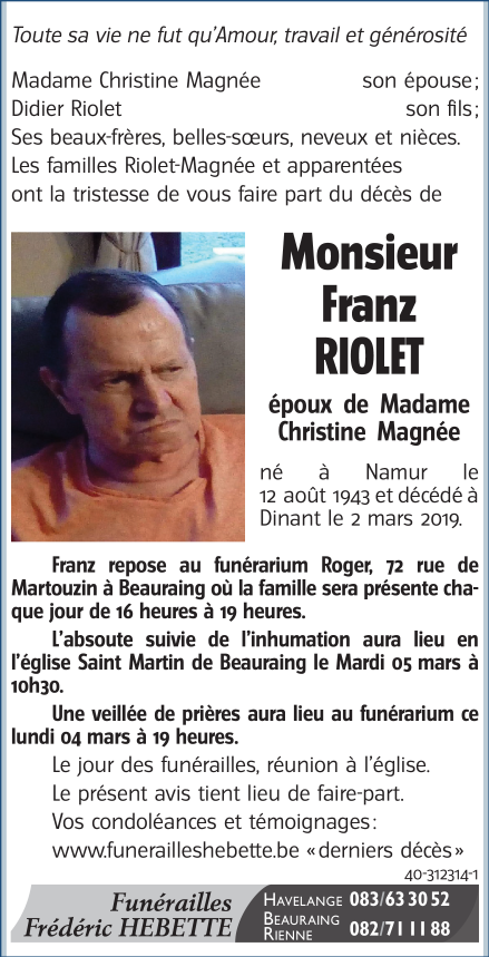 Décédé à Dinant (5500) le samedi 2 mars 2019 à l'âge de 75 ans