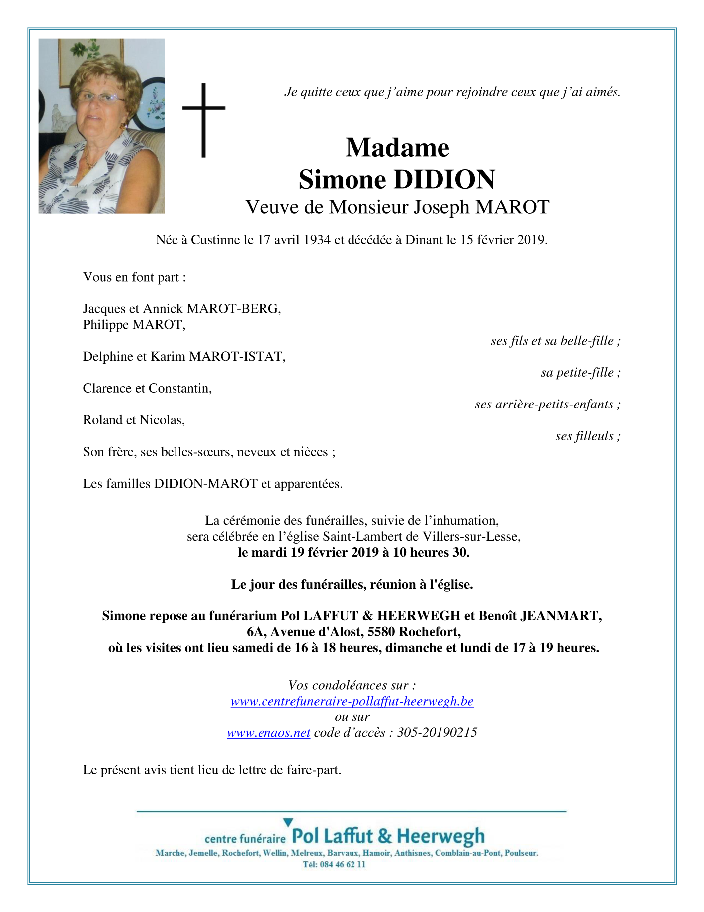 Fallecida en Dinant (5500) el viernes, 15 de febrero de 2019 a la edad de 84 años