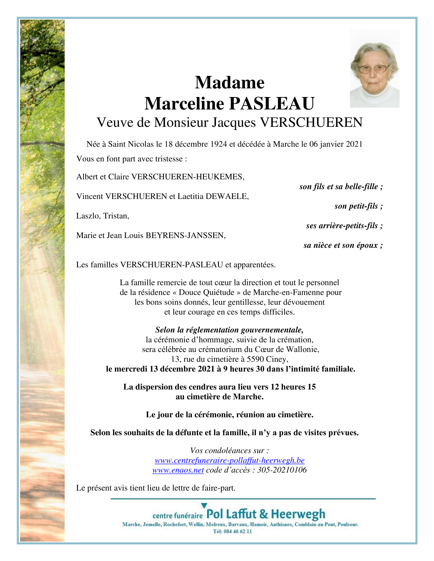 Overleden te Aye (6900) op woensdag 6 januari 2021 op 96-jarige leeftijd
