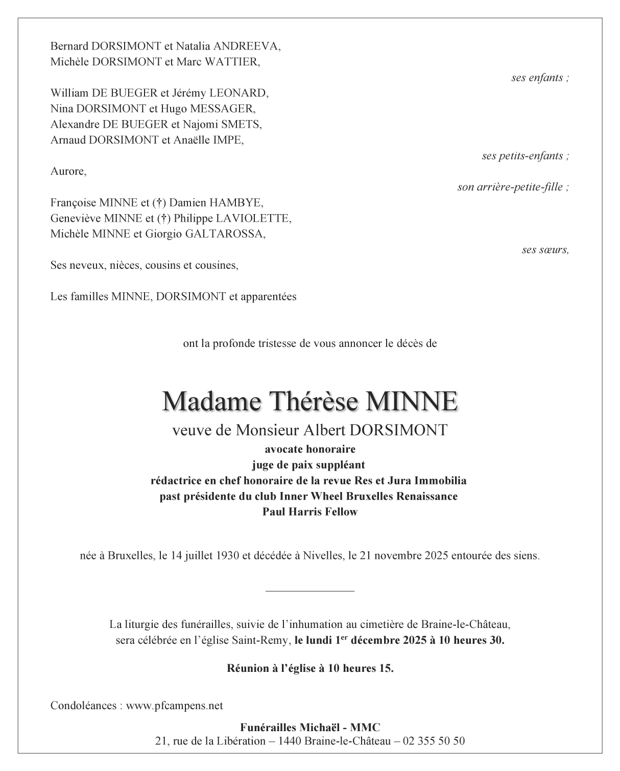 Died in Nivelles (1400) on 21 November 2025 at the age of 95 years