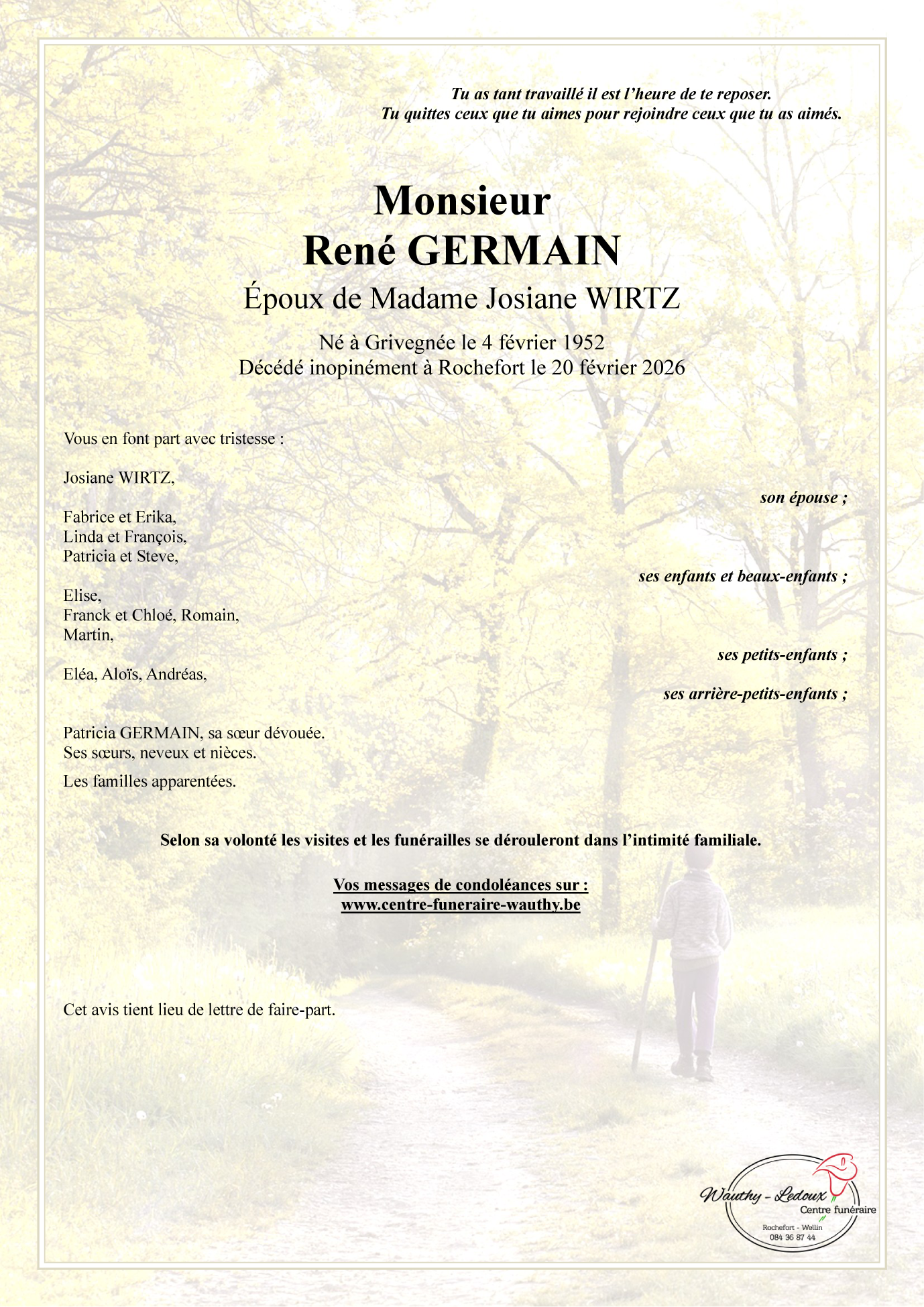Décédé à Rochefort (5580) le vendredi 20 février 2026 à l'âge de 74 ans