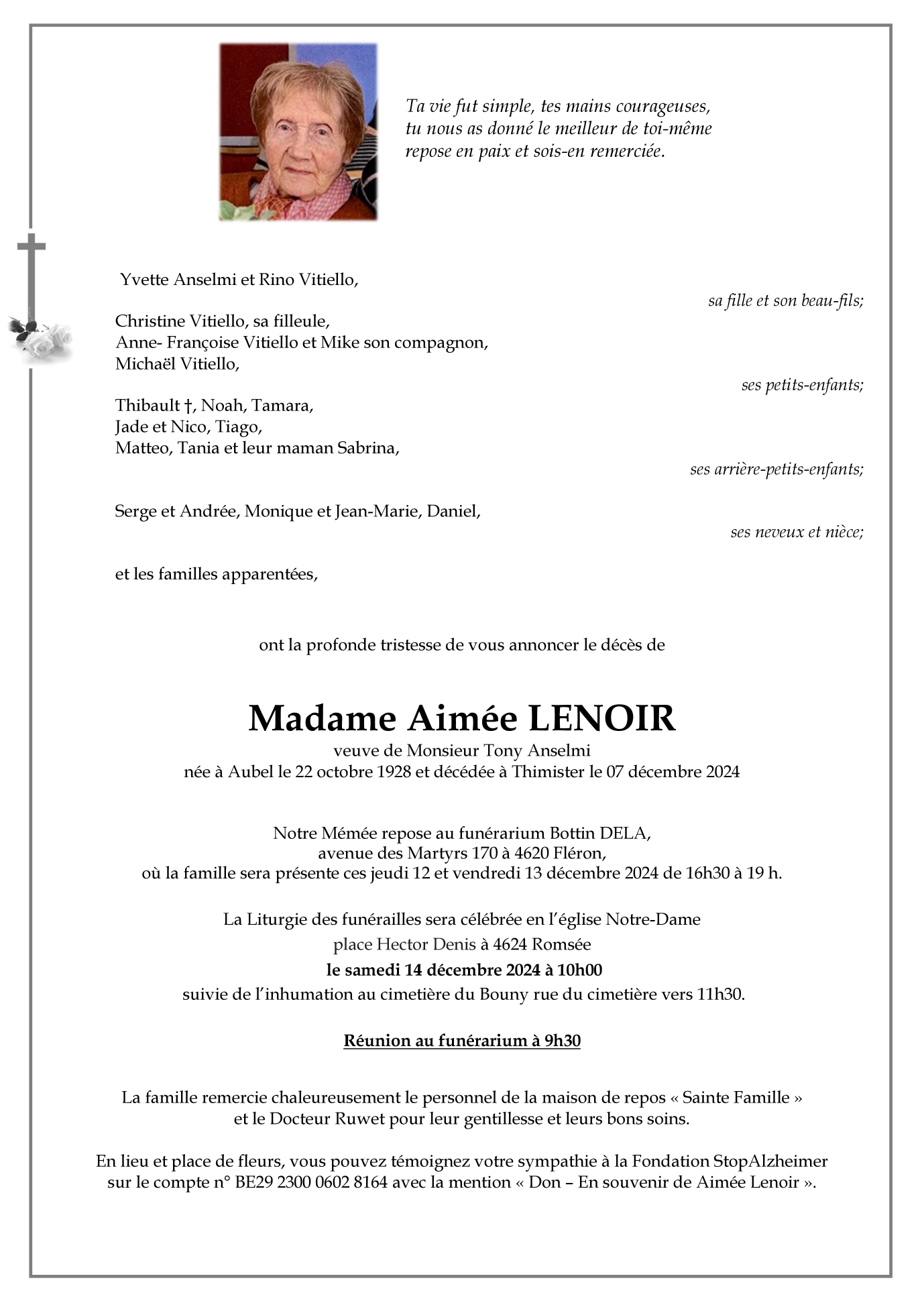 Décédée à Thimister-Clermont (4890) le samedi 7 décembre 2024 à l'âge de 96 ans