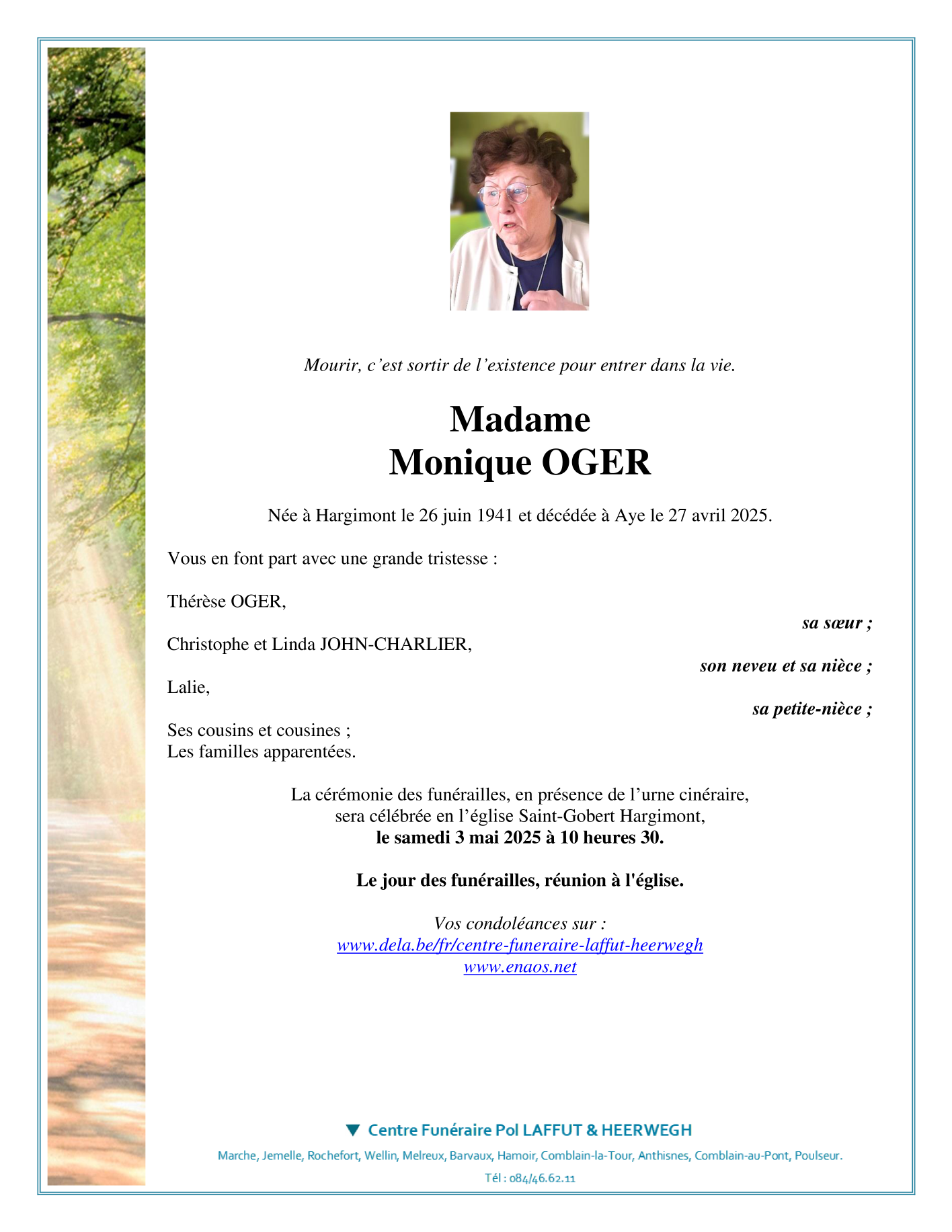 Décédée à Aye (6900) le dimanche 27 avril 2025 à l'âge de 83 ans