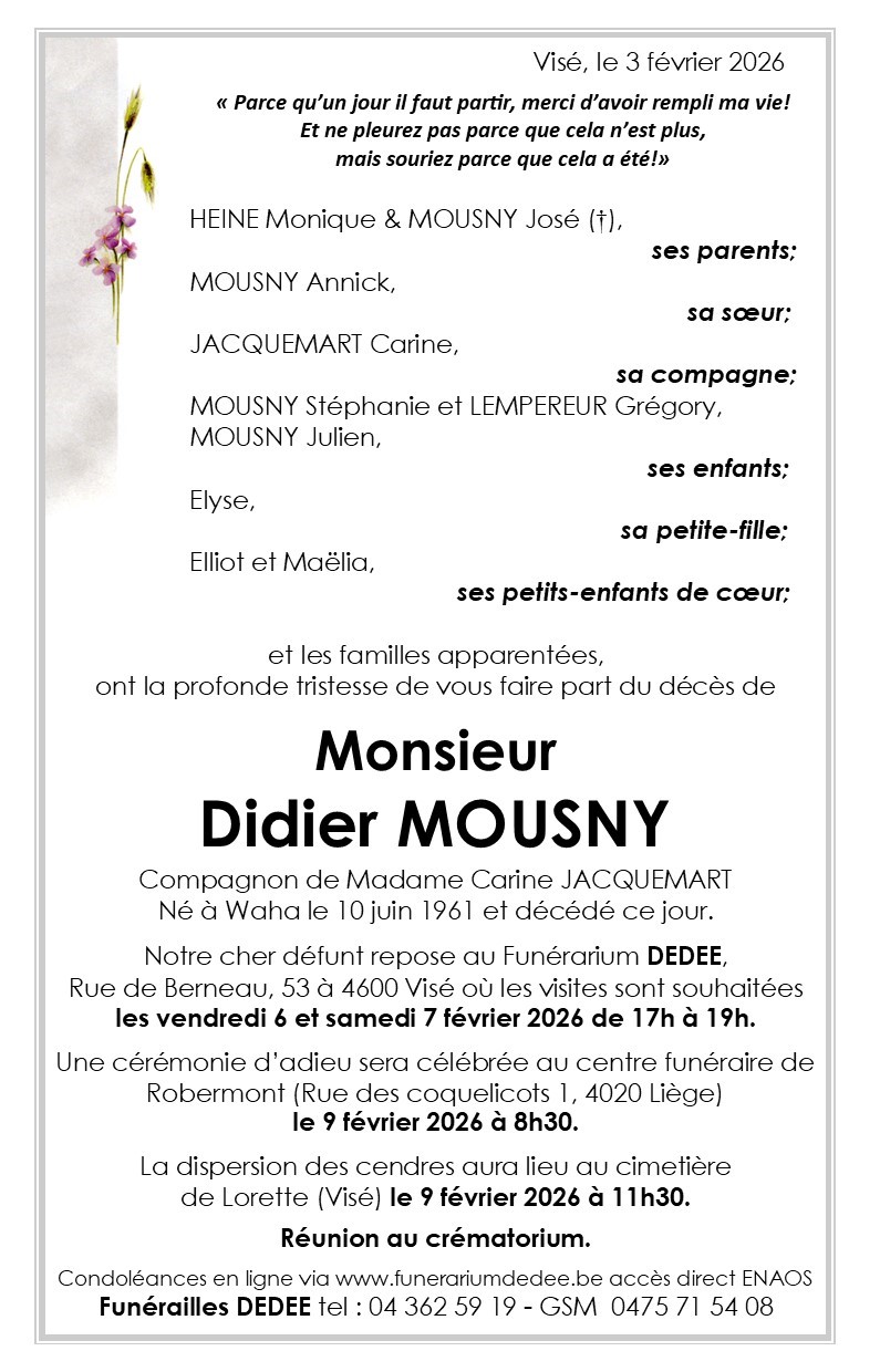 Décédé à Visé (4600) le mardi 3 février 2026 à l'âge de 64 ans