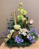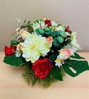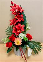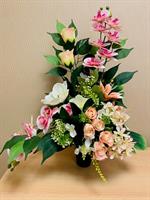 Bouquet lesté pour éviter la prise au vent ( roses, lys et orchidées) pouvant être mis dans un vase. Hauteur 70 cm