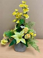 Pot en pierre lesté pour éviter la prise au vent, composé de fleurs artificielles dans les tons jaune (roses, lys, orchidées...) Hauteur 34 cm Largeur 12 cm