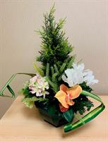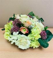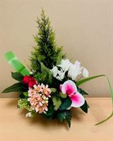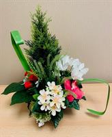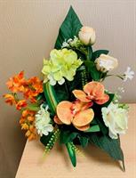 Bouquet de fleurs artificielles lesté pour éviter la prise au vent Fleurs blanches roses, orchidées, Hortensias (pouvant être mis dans un vase) Hauteur 60 cm Largeur 40 cm