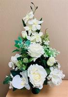 Bouquet lesté pour éviter la prise au vent dans les tons blanc ( rose et orchidées) composition pouvant être mise dans un vase. Hauteur: 60cm