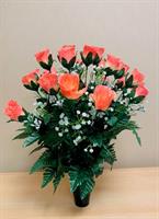 Bouquet lesté pour éviter la prise au vent. Roses roses (pouvant être mis dans un vase) Hauteur pot + fleurs 50 cm