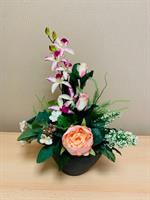 Coupe en plastique lesté pour éviter la prise au vent dans les tons saumons (roses hortensias et orchidées) Hauteur 40 cm Largeur 40 cm
