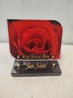 | Plaque funéraire en altuglace Plaque funéraire en altuglace , rose rouge. Socle en granit noir.