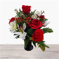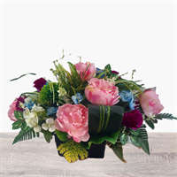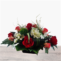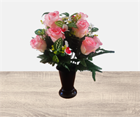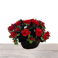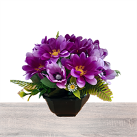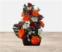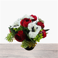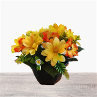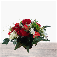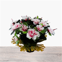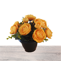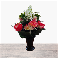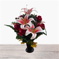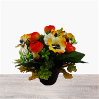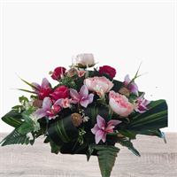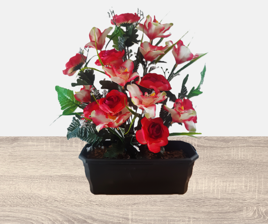 Jardinière avec des roses, lys et bégonias en tergal. Selon les coloris disponibles.