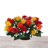 Jardinière avec roses rouges, jaunes et oranges en tergal.