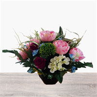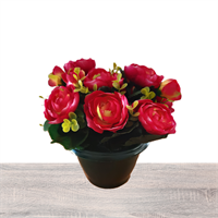 Jardinière avec des roses fuchsia et blanche en tergal. Selon les coloris disponibles.